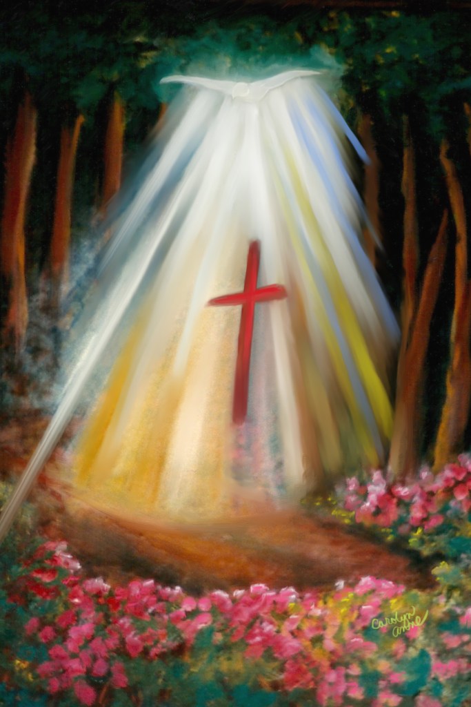 A decade later Jesus Christ shined His face upon me as I sat in darkness. He delivered me from vain religiosity and a pseudo-peace movement. So I expressed my joy at finally knowing the Light through a pastel. The woodland path this time was flooded with light and the source of the Light in the picture was obviously the cross of Christ and the Spirit dove. These two pieces of art adorned my home’s entryway for twenty years. Often people commented on them and I was able to tell them how the Lord is the Light in my life.