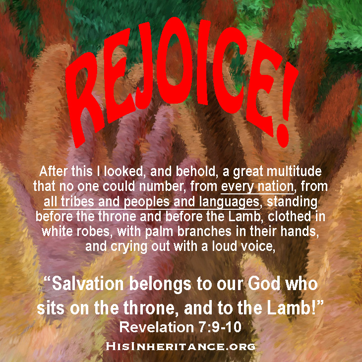 REV 7:9 After these things I looked, and behold, a great multitude which no one could number, of all nations, tribes, peoples, and tongues, standing before the throne and before the Lamb, clothed with white robes, with palm branches in their hands, 10 and crying out with a loud voice, saying, “Salvation belongs to our God who sits on the throne, and to the Lamb!”